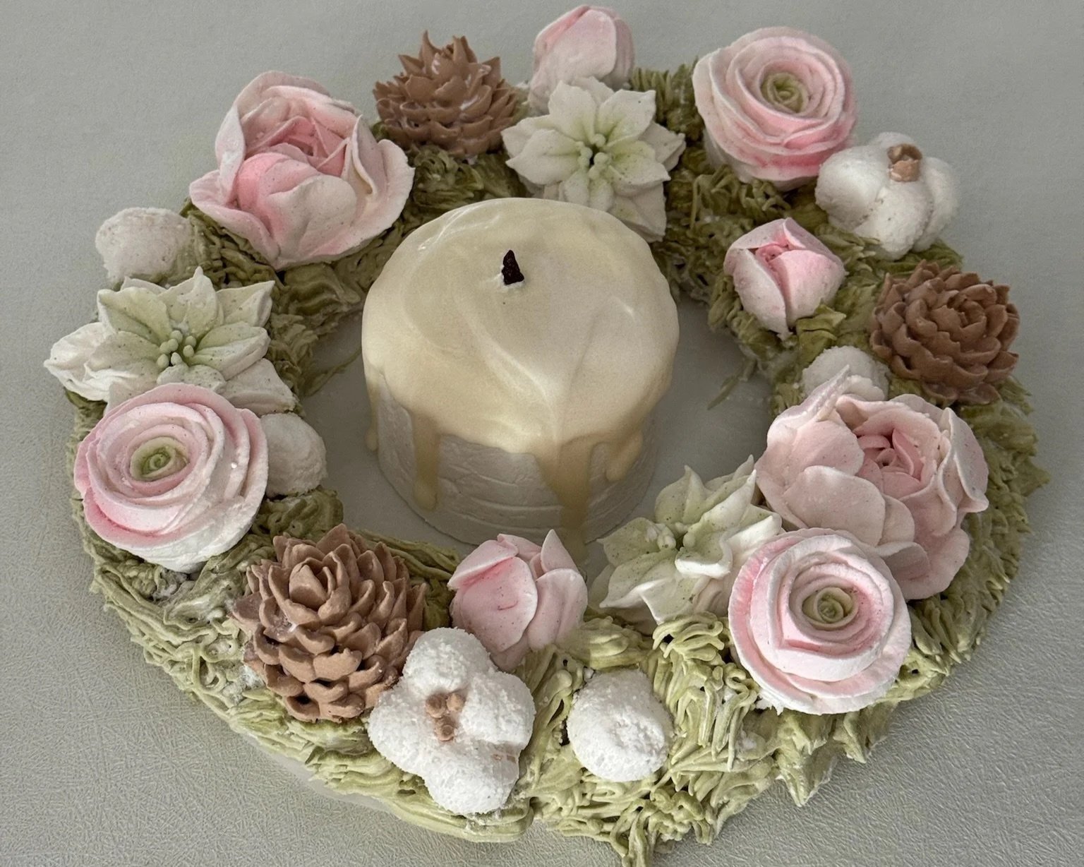 The Bouqedibles Zefir Floral Christmas Wreath Course is designed to teach you how to pipe all the necessary elements and arrange them together into a festive wreath filled with delicious jam.